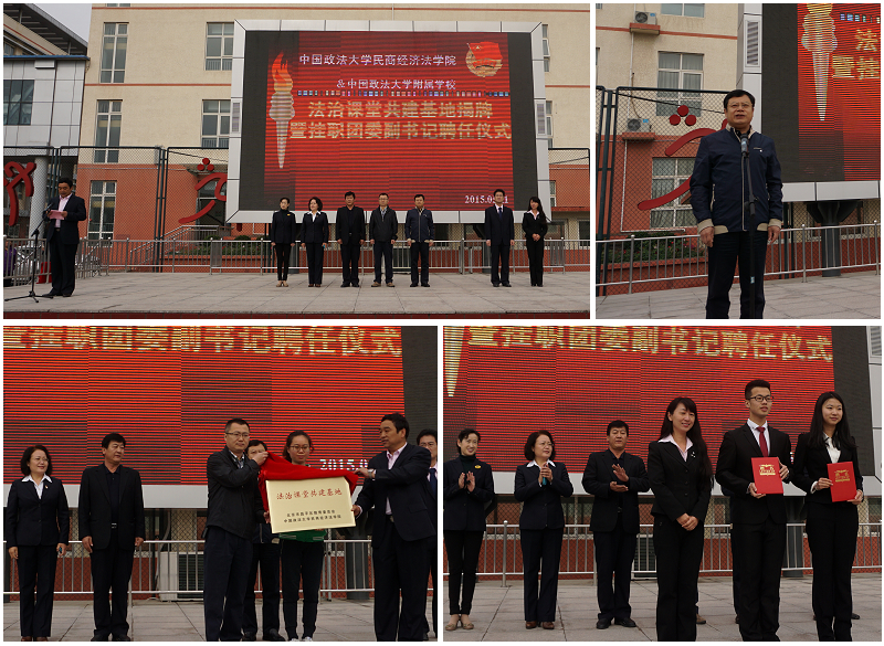 仪式上,王洪松与咸长良为“法制课堂”共建基地揭牌,王霞为受聘的两位挂职团委副书记魏若竹、潘辉颁发聘书。
