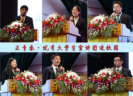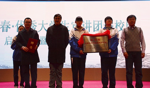 宣讲活动伊始,在老师同学们的翘首期待下,王洪松和张威共同为本次系列活动的启动揭牌,并由柏连亮主任为王洪松颁发聘书。随后,王洪松、张威、柏连亮先后致辞,他们在讲话中提到,宣讲活动是在“如何让高校和普教的携手并进”的大课题下开展的一次成功示范,希望通过优秀大学生的事迹宣讲,搭建大学生与中学生展示自己的平台,实现中学生和大学生成长经历的接轨,在参加者彼此心中播下一颗种子、点燃一份希望、激励一份信心、传递一份力量,促进中学生更好地学习生活。希望学生们能很好地珍惜和利用本次机会,有所收获,有所感悟,实现个人的成长进步。