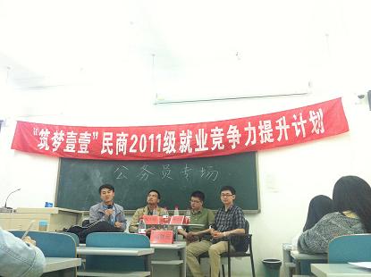 5月8日,北京公务员考试专场在端204教室举行。本场交流会邀请到2008级本科毕业生甄少松(现就职于北京市昌平区人民法院)、2008级本科毕业生施竹毅(现就职于北京市昌平区检察院)、2009级本科毕业生王星云(现就职于北京市检察院第三分检)和2010级本科生薛汉荻(已被北京市朝阳区检察院招录),2011级辅导员刘贺元参加本次活动。嘉宾分别从报名、笔试、专业科目考试、资格复审、面试和政审体检六个环节,分享了相关经验和技巧,并讲述了现在个人的工作状态,和对于公务员职业的体会。本次活动让大家对公务员考试有了更进一步地了解,为同学们合理地安排接下来的各场考试提供了很大地帮助,让与会同学们能够稳扎稳打,自信从容地踏上公务员的征程。
